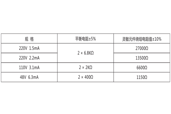 該繼電器的電流和直流電壓: (220V、1.5mA);(110V、3.1mA) ; (48V、6.3mA)。功率消耗:在直流220V額定電壓下繼電器動作后的功率消耗不大于5W。熱穩定性(過載能力):繼電器可長期承受110%額定電壓。工作壽命:產品可靠工作壽命為104。介質強度:在基準條件下,產品各導電部分連在一起,對外露非帶電金屬部分及外殼之間,能承受交流有效值2000V/50HZ的試驗電壓歷時1分鐘,無絕緣擊穿或閃絡現象。觸點性能:在電壓不超過250V,電流不超過2A,時間常數為5±0.75ms的直流有感負荷電路中產品輸出的斷開容量為50W。在電壓不大于250V,電流不大于1A的交流電路中功率因數為0.4±0.1)斷開容量為250VA。