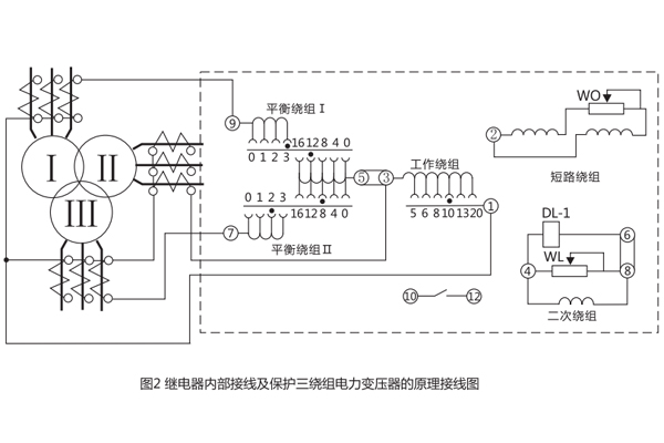 變流器的導(dǎo)磁體由“E”形導(dǎo)磁片疊裝而成,有平衡繞組和短路繞組。此外,中間柱上的短路繞組與右側(cè)邊柱上的短路繞組通過(guò)一瓷盤(pán)電位器相連接,二次繞組放在導(dǎo)磁體的另一側(cè)邊柱上。繞組在導(dǎo)磁體的分布如圖1所示。繼電器的內(nèi)部接線及其保護(hù)三繞組電力變壓器的原理接線圖如圖2所示。由于具有平衡繞組,且每隔一匝有抽頭,便于調(diào)整用以消除由于電流互感器變比不一致等原因引起的不平衡電流的效應(yīng)。具有兩個(gè)平衡繞組就使得繼電器能用于保護(hù)三繞組的電力變壓器。