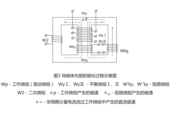 具有短路繞組的變流器,其特點是專門利用非周期性電流來磁化導磁體,圖3表示了導磁體內部的電磁過程,當電力變壓器空載合閘時, 瞬時值很大的勵磁涌流全部流過工作繞組,涌流波形具有偏于時間軸的磁通。它們在短路線組里產生兩種不同的反應,直流磁通的作用下,導磁體迅速飽和,大大降低了導磁率,這就大大惡化了工作繞組與二次繞組間的電磁感應條件,因而顯著增大了繼電器的動作電流,這就是所謂直流偏磁作用。