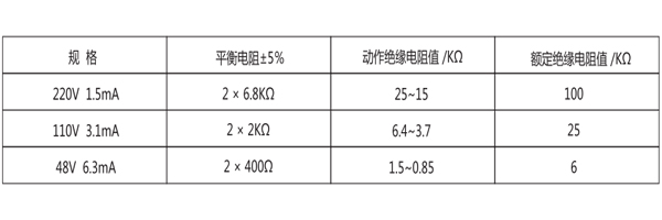 繼電器動作值:當母線任何一側對地絕緣電阻下降到下表規定值時,繼電器應可靠動作。