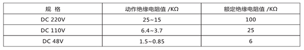繼電器動作值:當母線任何一側對地絕緣電阻下降到下表規定值時.繼電器應可靠動作。