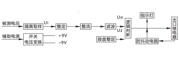 被測電壓經過電阻分壓取樣,得到與被測電壓成比例的取樣電壓Ui , Ui經撥盤整定,再進行整流濾波,得到直流Uo ,邏輯回將Uo與門坎電壓Uz進行比較。對欠電壓繼電器,若Uo> Uz ,則出口繼電器不動作;若Uo