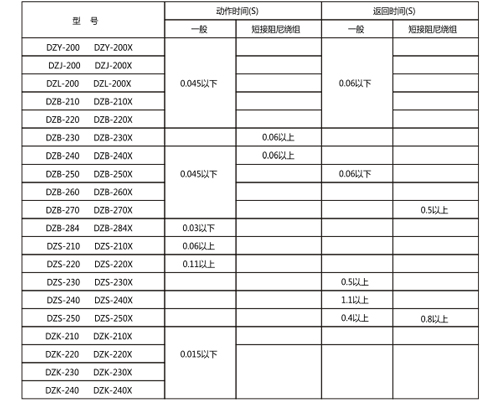 2.1動作電壓與保持電壓不大于70%額定電壓, DZY(J)-220X動作電壓不大于80%額定電壓;動作電壓不小于30%額定電壓, DZK-200及DZB 243不小于50%額定電壓。
